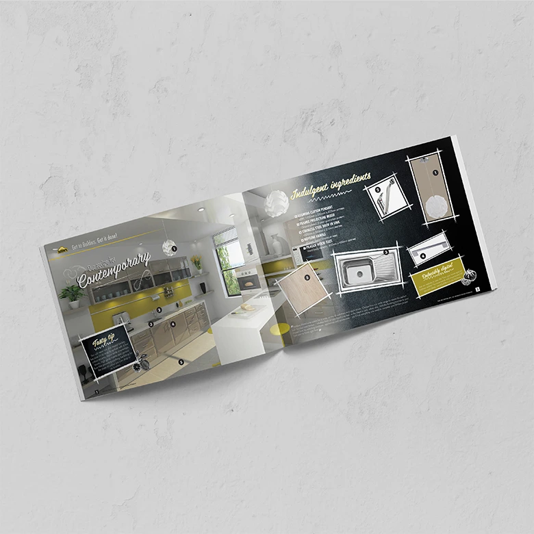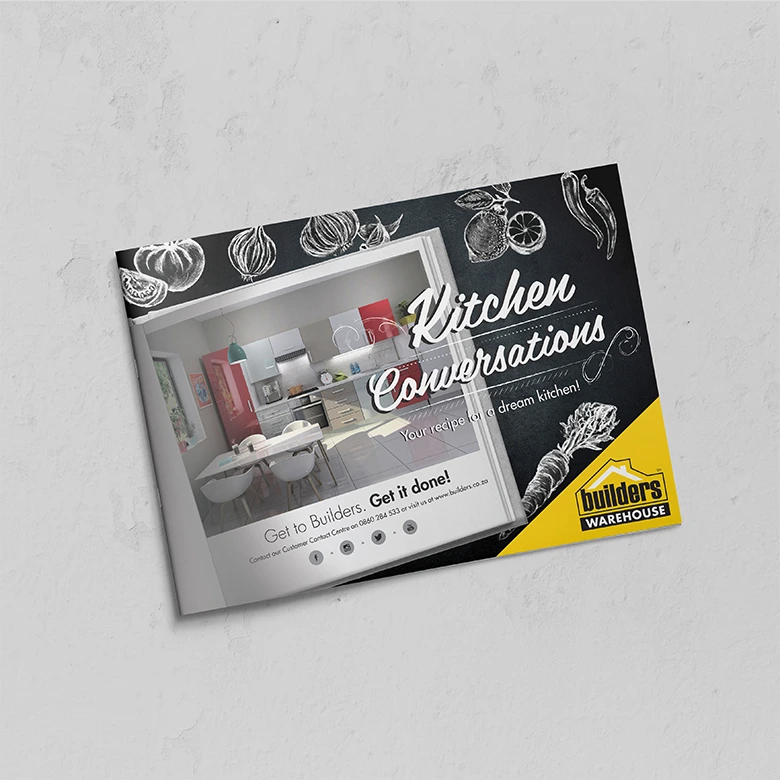 Project Description: The first edition of the Builders Kitchen catalogue, showcasing the different kitchen design solutions that were on offer at Builders Warehouse stores. The designs ranged from country to contemporary finishes. Medium: Print – saddle-stitched Dimensions: A4 Landscape